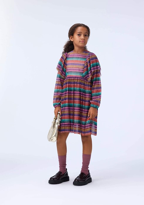 Metallisk lilla håndtaske med lynlåslukning. Tasken måler 25 cm i bredden og 13,5 cm i højden