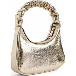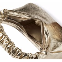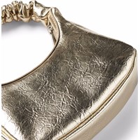 Guldfarvet håndtaske med lynlåslukning. Tasken måler 25 cm i bredden og 13,5 cm i højden