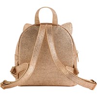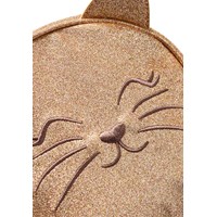 Rygsæk med katteører, broderi og guldglimmer. Har lynlås og justerbare skulderstropper. Perfekt til små kattefans. Mål: 18 × 10 × 20 cm.