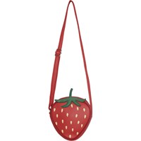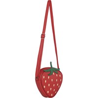 Rød jordbær-skuldertaske, med grøn stilk og regulerbar strop.