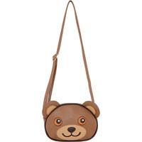 Brun crossbody taske med en justerbar skulderrem og et sødt motiv af en bamse på fronten.