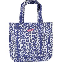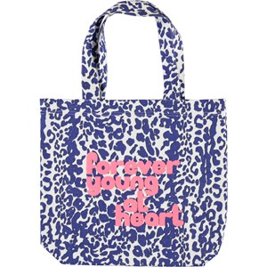 Totebag i blå leopard print med teksten 'Forever young at heart' på fronten.