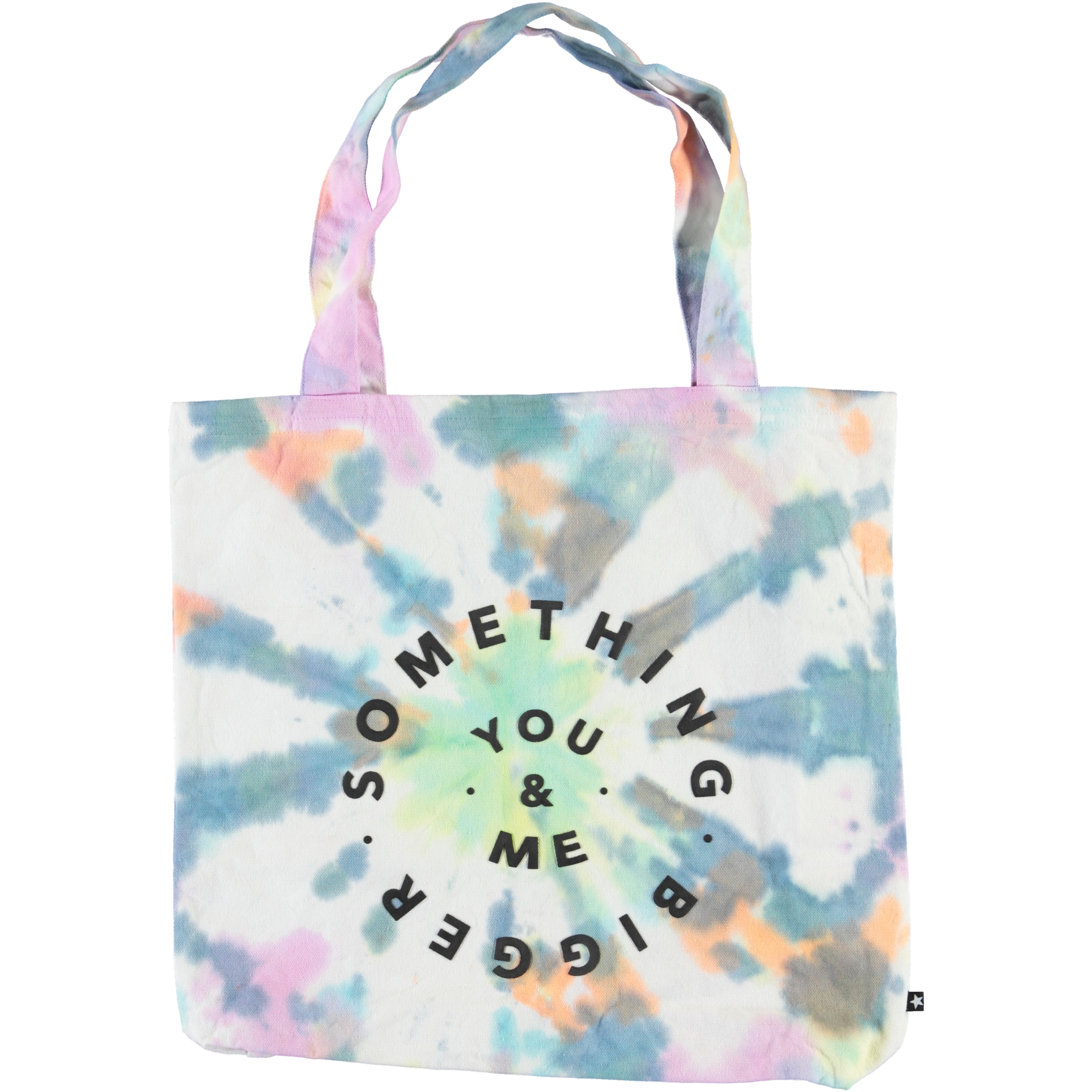 Multi farvet tie-dye totebag med tekst på fronten.