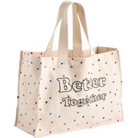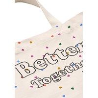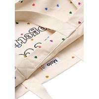 Tote bag i ubleget, økologisk bomuld med farverigt hjerte- og tekstprint. Enkel og praktisk til hverdag. Måler 38cm i bredden og 28cm i højden.