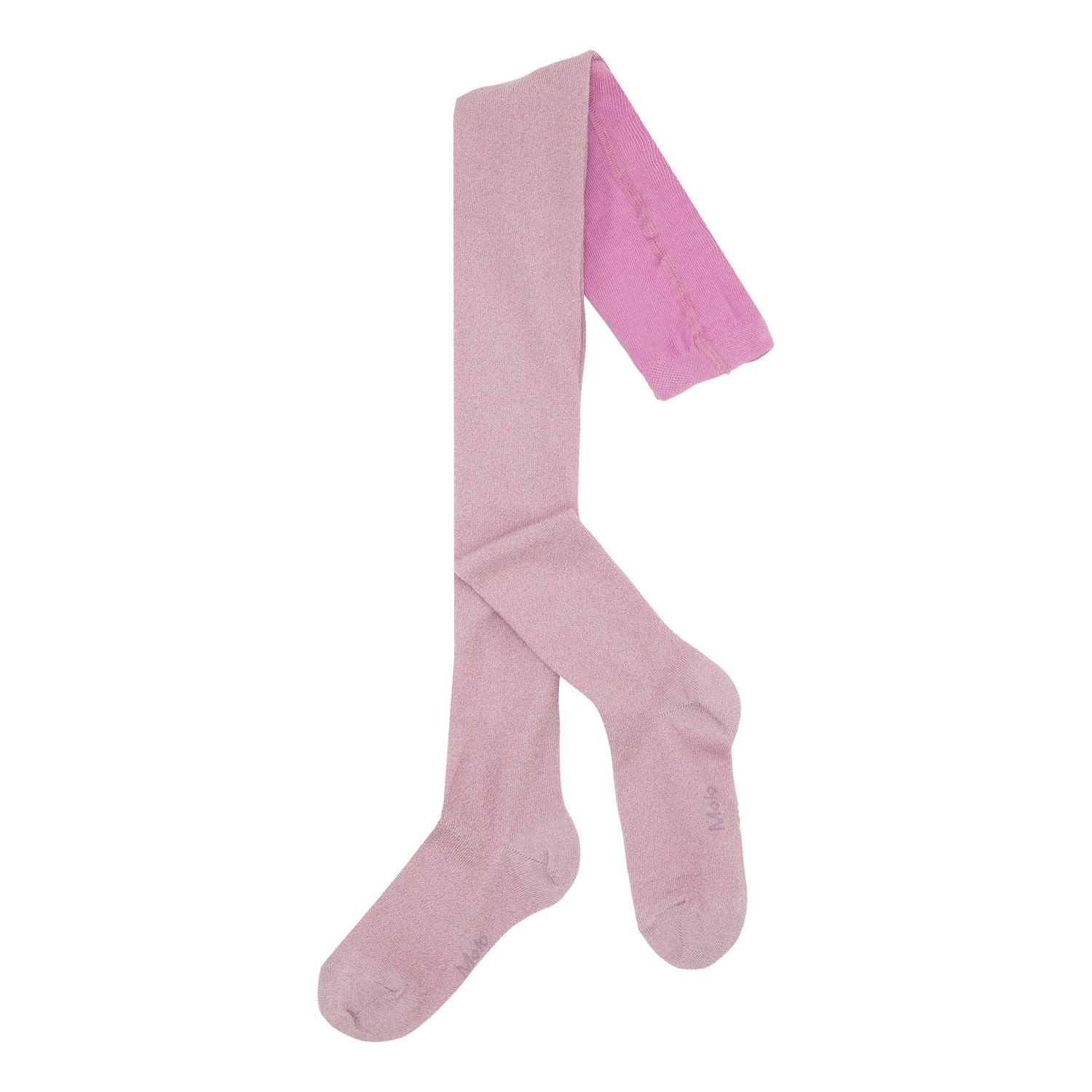 Et par strømpebukser i pink med glitter. Molo's logo er vævet ind i lilla under hver fod.