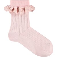 2-pak finstrikkede strømper i bomuld med ribbet skaft og blondekant. Pakken indeholder et par lyserøde og et par hvide.