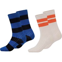 To par sporty strømper i rib. Det ene par strømper har brede blå og sorte striber, mens det andet par er lys cremefarvede med orangerøde striber.