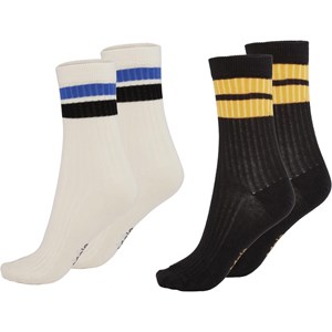 To par sporty strømper i rib. Det ene par strømper er i hvid med blå striber, mens det andet par er sorte med gule striber.