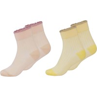 To par ankelstrømper med fin bølget kant med glitter i. Det ene par er rosa og det andet par er lysegule.
