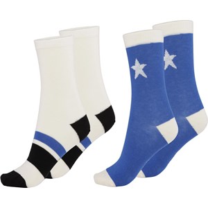To par strømper i hvid og blå. Det ene par med indstrikket stjerne og det andet med striber.