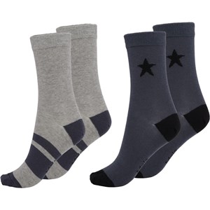 To par strømper i blå og grå. Det ene par med indstrikket stjerne og det andet med striber.