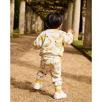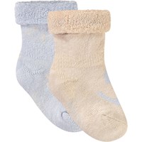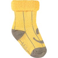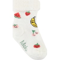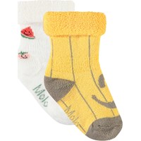 2-pak babysokker i viskose. Sokkerne er henholdsvis hvide med glade frugter og gule med striber og et smilende ansigter.