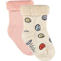 2-pak babysokker i viskose. Pakken indeholder et par rosa sokker med et smilende ansigt og et par råhvide sokker med multifarvede ansigter.