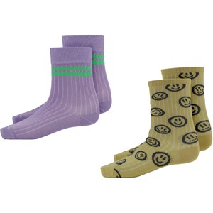 To par strømper. Det ene par er i rib og er lilla med to grønne striber ved anklen. Det andet par er karrygule med smilende ansigter på.