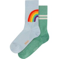 2-pak finstrikkede strømper i blød bomuldsblanding med ribbet skaft og elastik foroven. Pakken indeholder et par lyseblå strømper med regnbue-motiv bagpå skaftet og et par grønne glimmerstrømper med to hvide striber øverst på skaftet.