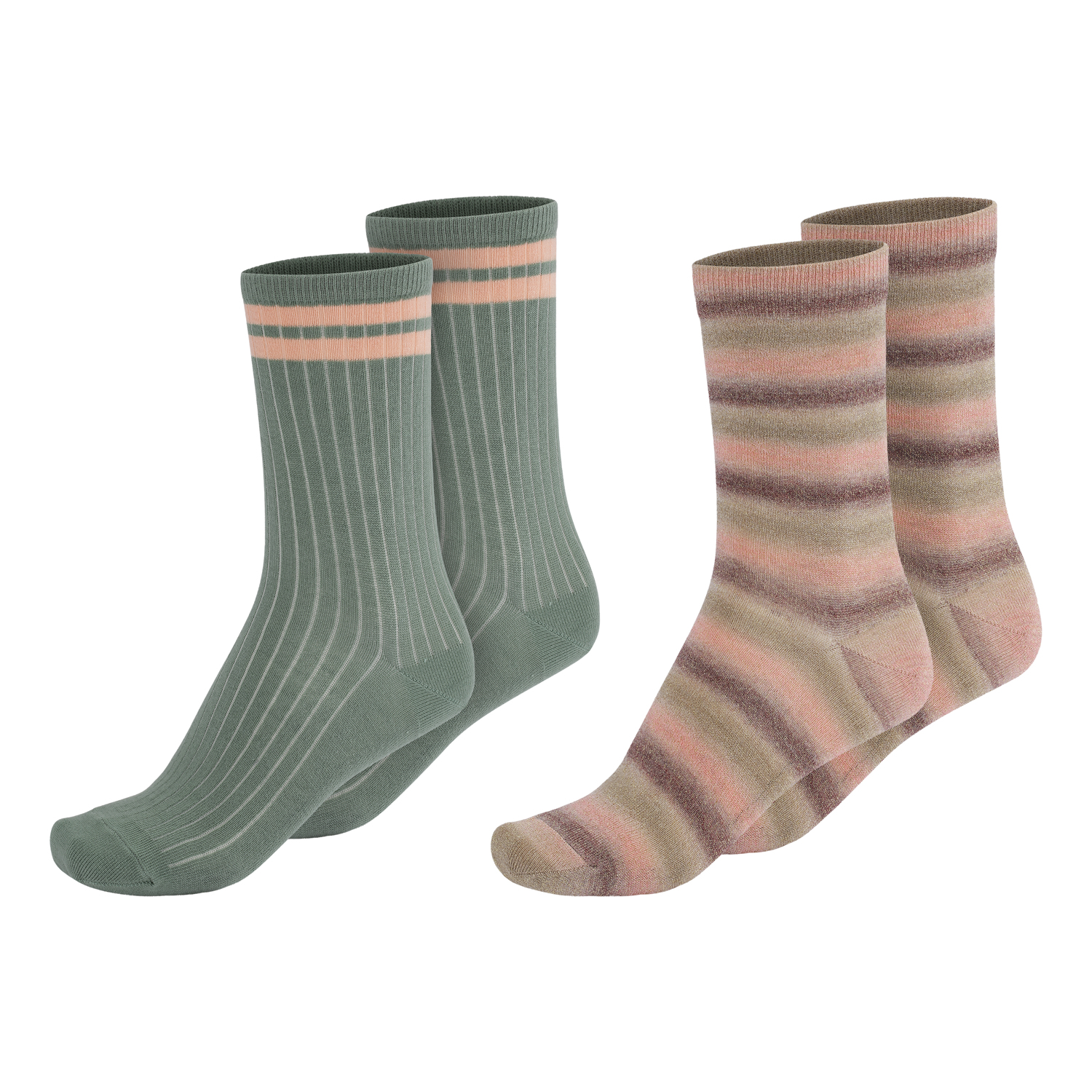 To par strømper i rib. Det ene par er er grønne med rosa striber i toppen, mens det andet par er stribede.
