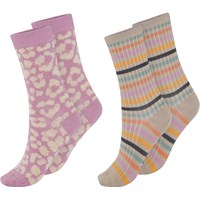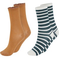 To par strømper i rib. Det ene par er blå og hvid stribet, mens det andet par er guld farvet og har en fin kant.