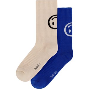 2-pak finstrikkede strømper med smiley-motiv bagpå i blød bomuldsblanding med ribbet skaft og elastik foroven. Pakken indeholder et par beige og et par blå strømper, begge med smiley-motiv bagpå skaftet.