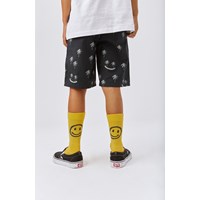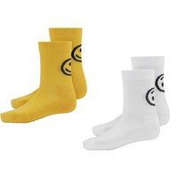 To par sporty strømper i rib. Det ene par strømper er gule, det andet er hvide, og begge har smilende ansigter bagerst på skaftet.