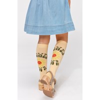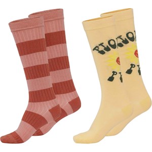 To par lange strømper. Det ene par er rosa og røde i striber og det andet par er lysegule med teksten ’FLOWER PWR’ og en fin smileyblomst.