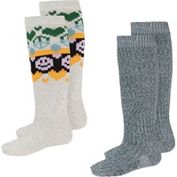 To par lange strømper. Det ene par er grå med groft rib strik, mens det andet par er lysegrå med smileyer og peacetegn.