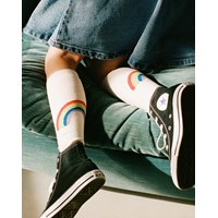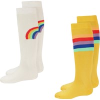 Her er to par strømper i gul og hvid med ekstra længde. Begge par strømper har regnbue print.