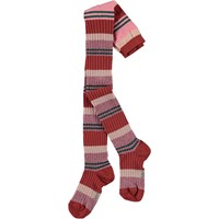 Strømpebukser med brede og smalle striber i rød, lyserød og lilla. Strømpebukserne er i rib og med glimmer.