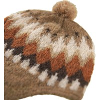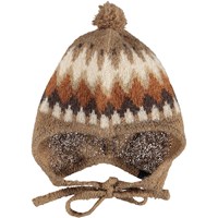 Brun kyse i alpaka-uldblanding til de mindste med nordisk inspireret mønster. Kysen kan bindes tæt til ansigtet med snøre under hagen og har en sød lille påsyet top. Kombinere med matchende ulddragt for et fint og varmt sæt.