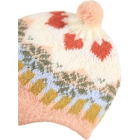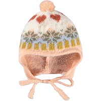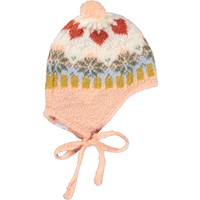 Rosa kyse i alpaka-uldblanding til de mindste med nordisk inspireret mønster. Kysen kan bindes tæt til ansigtet med snøre under hagen og har en sød lille påsyet top. Kombinere med matchende ulddragt for et fint og varmt sæt.