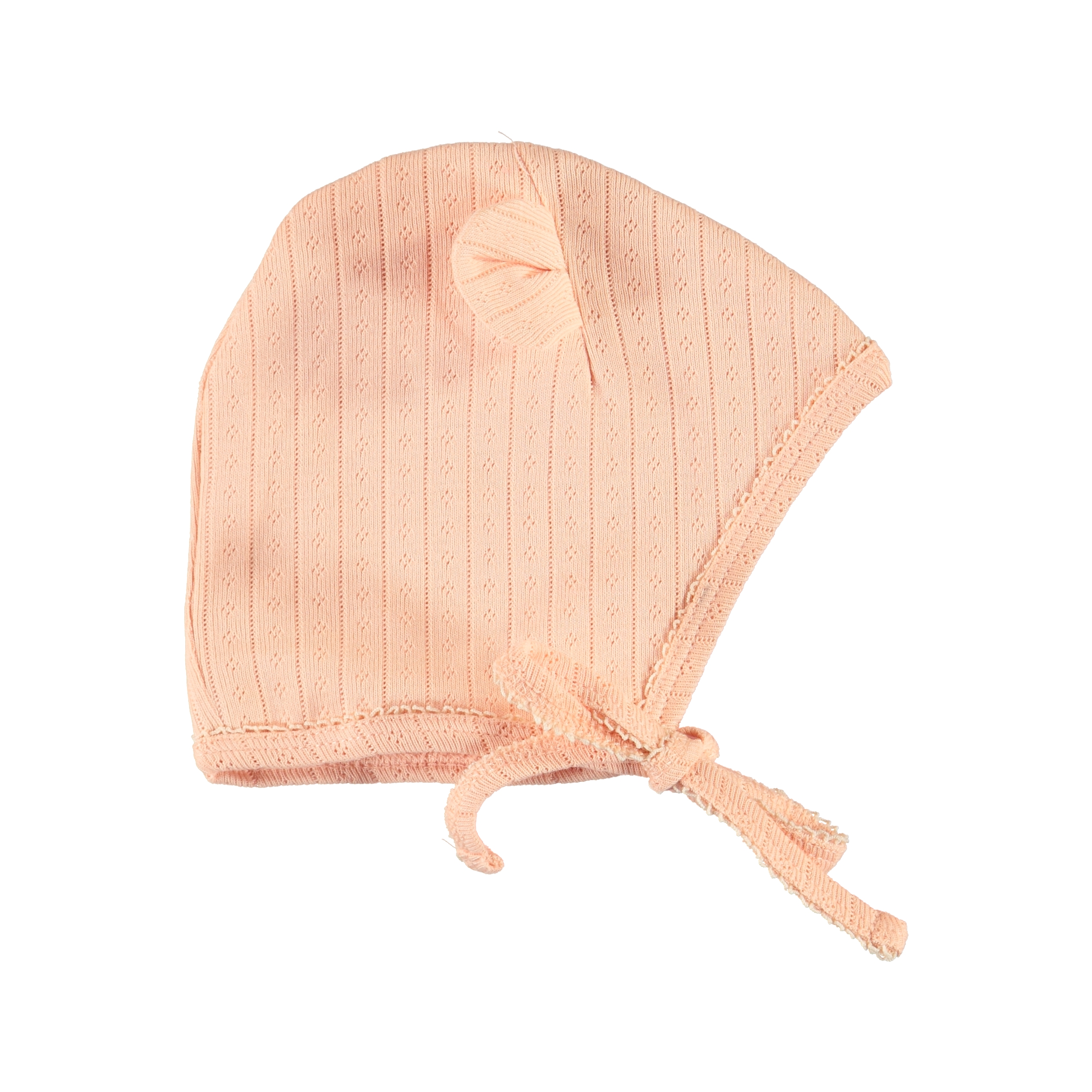 Koral farvet babyhue i hulmønstret strik med små påsatte ører. Huen kan bindes tæt til ansigtet med snøre under hagen.