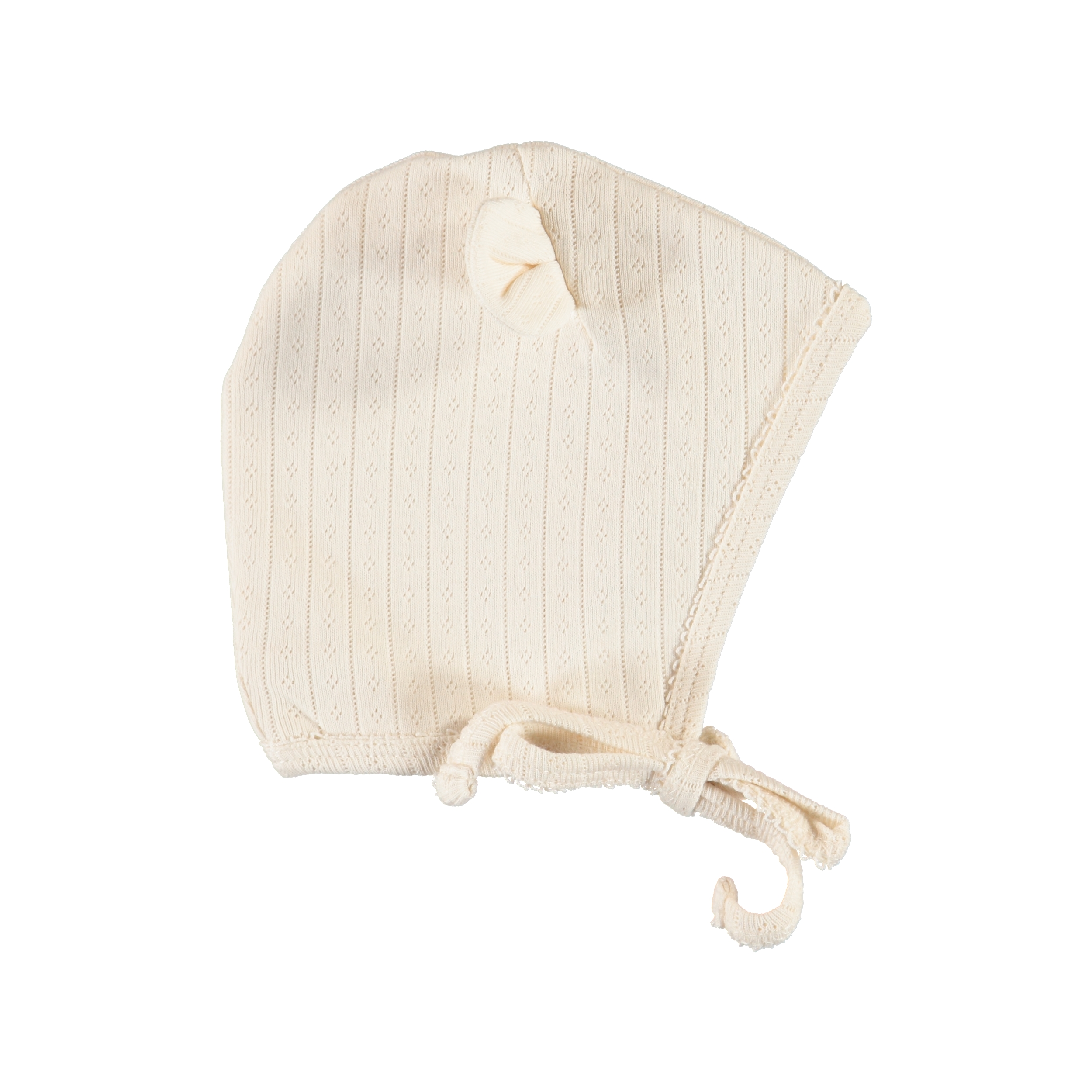 Hvid babyhue i hulmønstret strik med små påsatte ører. Huen kan bindes tæt til ansigtet med snøre under hagen.
