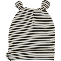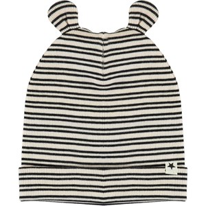 Stribet rib babyhue i farverne rosa og sort. Huen har ombuk og påsatte søde ører.