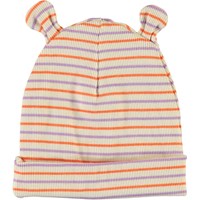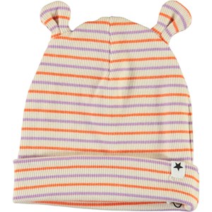 Stribet rib babyhue i farverne rosa, orange og lilla. Huen har ombuk og påsatte søde ører.