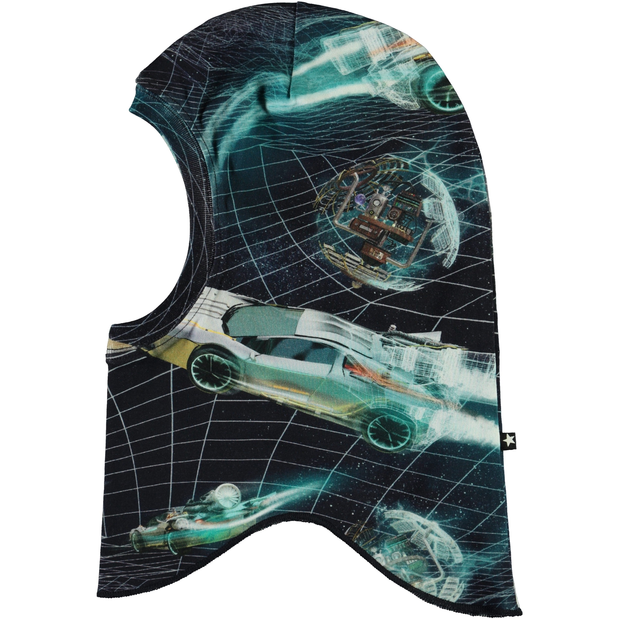 Farverig elefanthue med print af fremtidens tidsmaskiner.