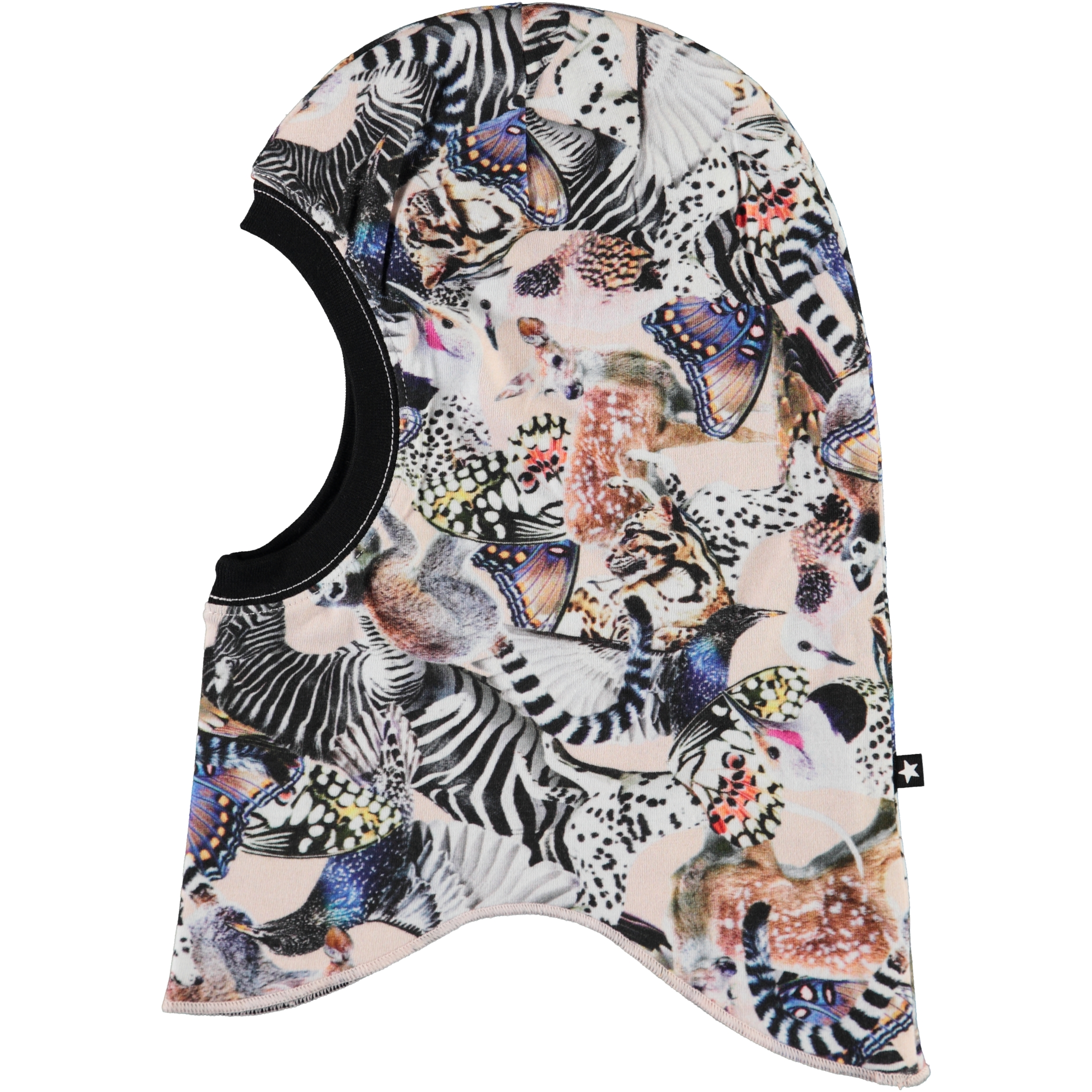 Elefanthue med print af forskellige dyr, som sammen danner et flot mønster.