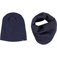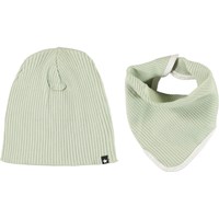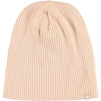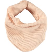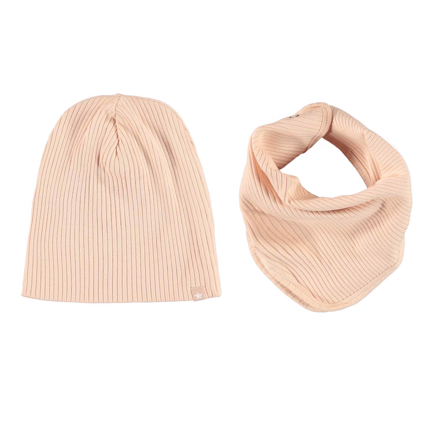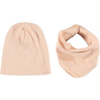 Rosa babyhue og hagesmæk i rib kvalitet. Hagesmækken lukkes med trykknap i nakken.
