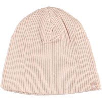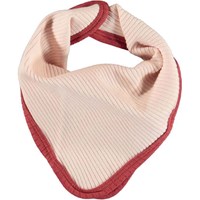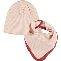 Pudderfarvet babyhue og hagesmæk i rib kvalitet med rød kant. Hagesmækken lukkes med trykknap i nakken og har brun kant.
