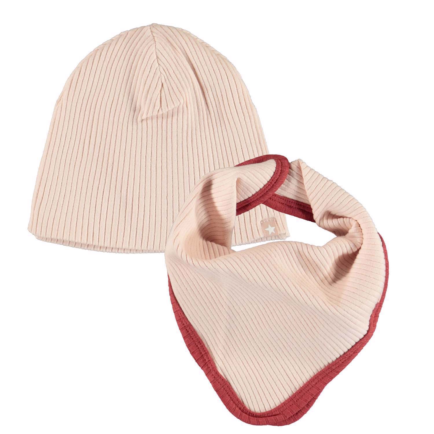Pudderfarvet babyhue og hagesmæk i rib kvalitet med rød kant. Hagesmækken lukkes med trykknap i nakken og har brun kant.