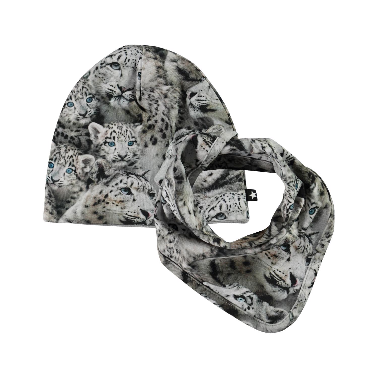 Babyhue og hagesmæk med print af sneleoparder. Hagesmækken lukkes med trykknap i nakken.