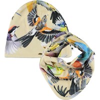 Babyhue og hagesmæk i gul med print af forskellige dyr, som er kommet en tur på månen. Hagesmækken lukkes med trykknap i nakken.