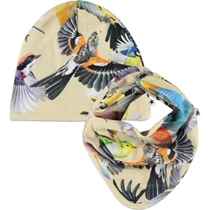 Babyhue og hagesmæk i lysegul med print af forskellige fugle. Hagesmækken lukkes med trykknap i nakken.