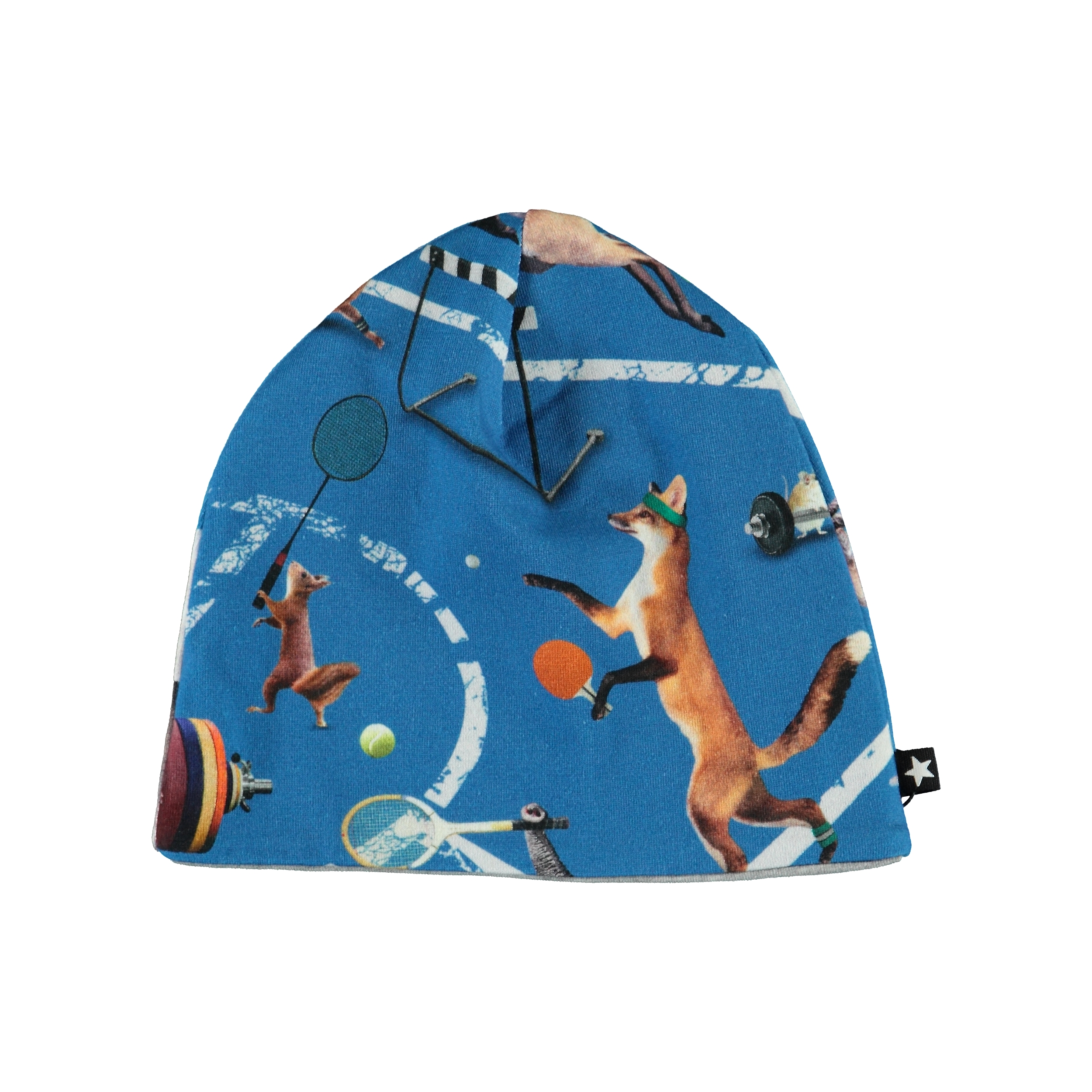 Lyseblå hue med print af forskellige dyr, som dyrker sport.