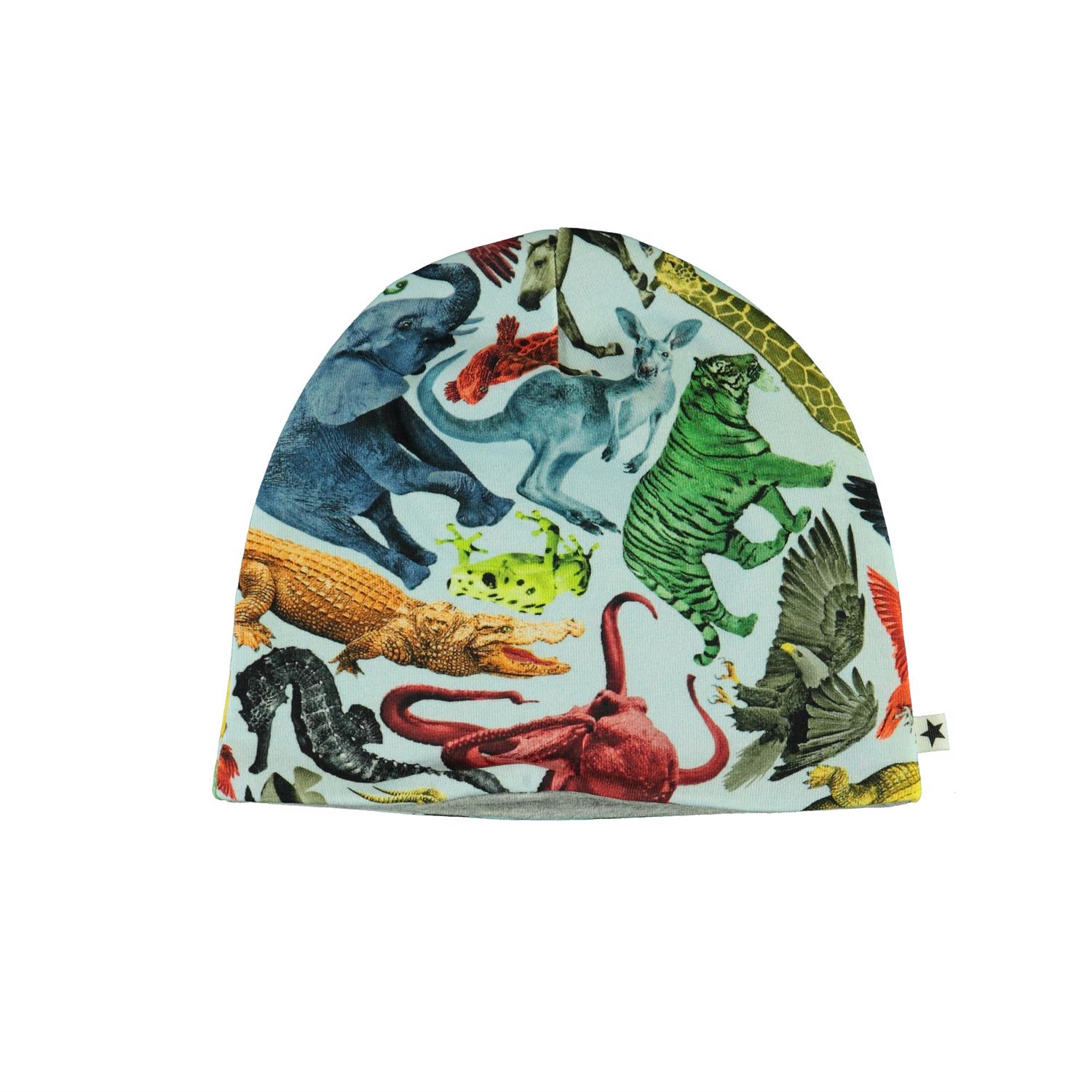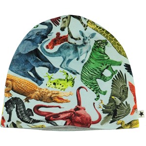 Lyseblå babyhue med print af forskellige dyr. Huen kan bruges med og uden ombuk. Certificeret af Ecocert Greenlife, certifikationsnr. 197496.