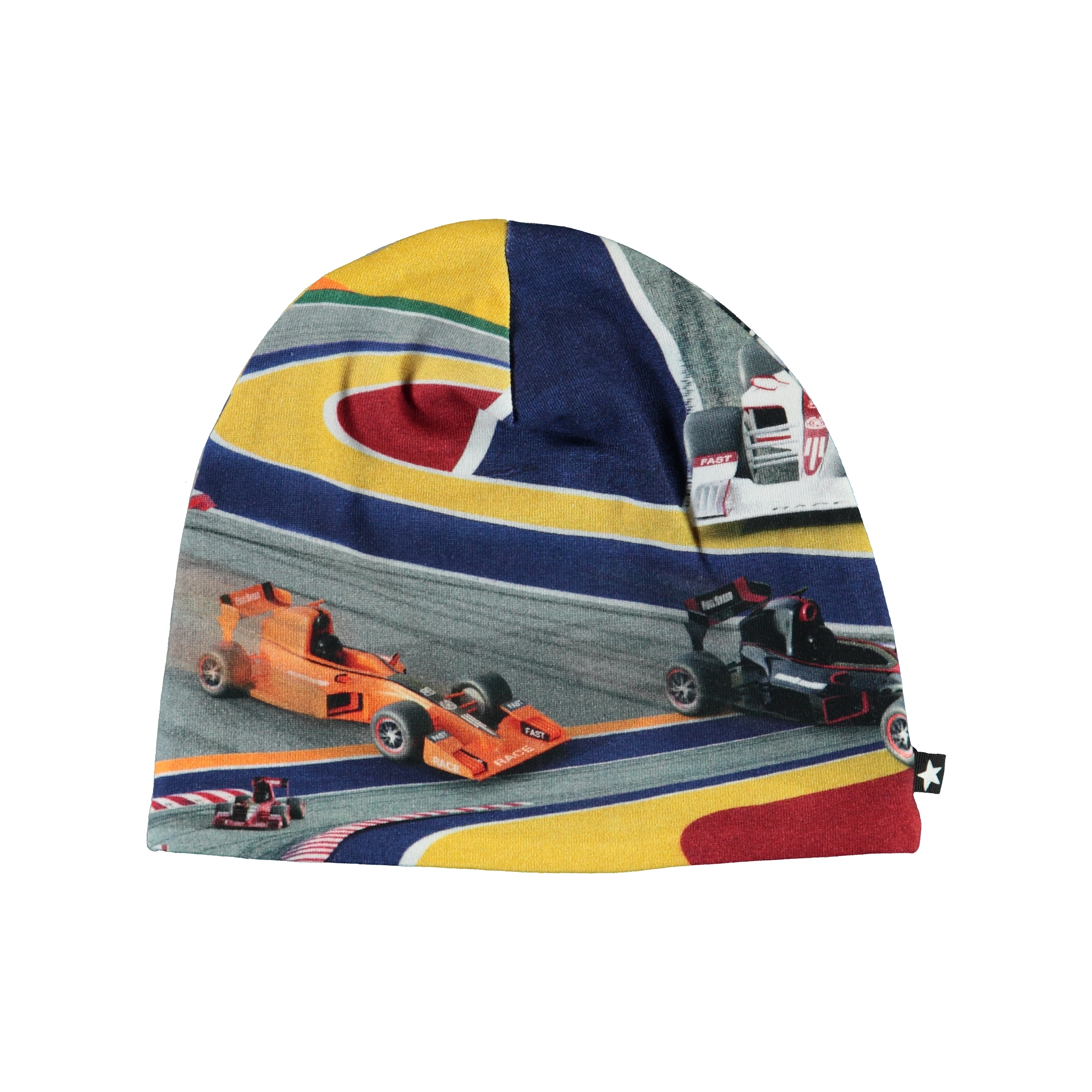 Farverig hue med print af racerbiler.