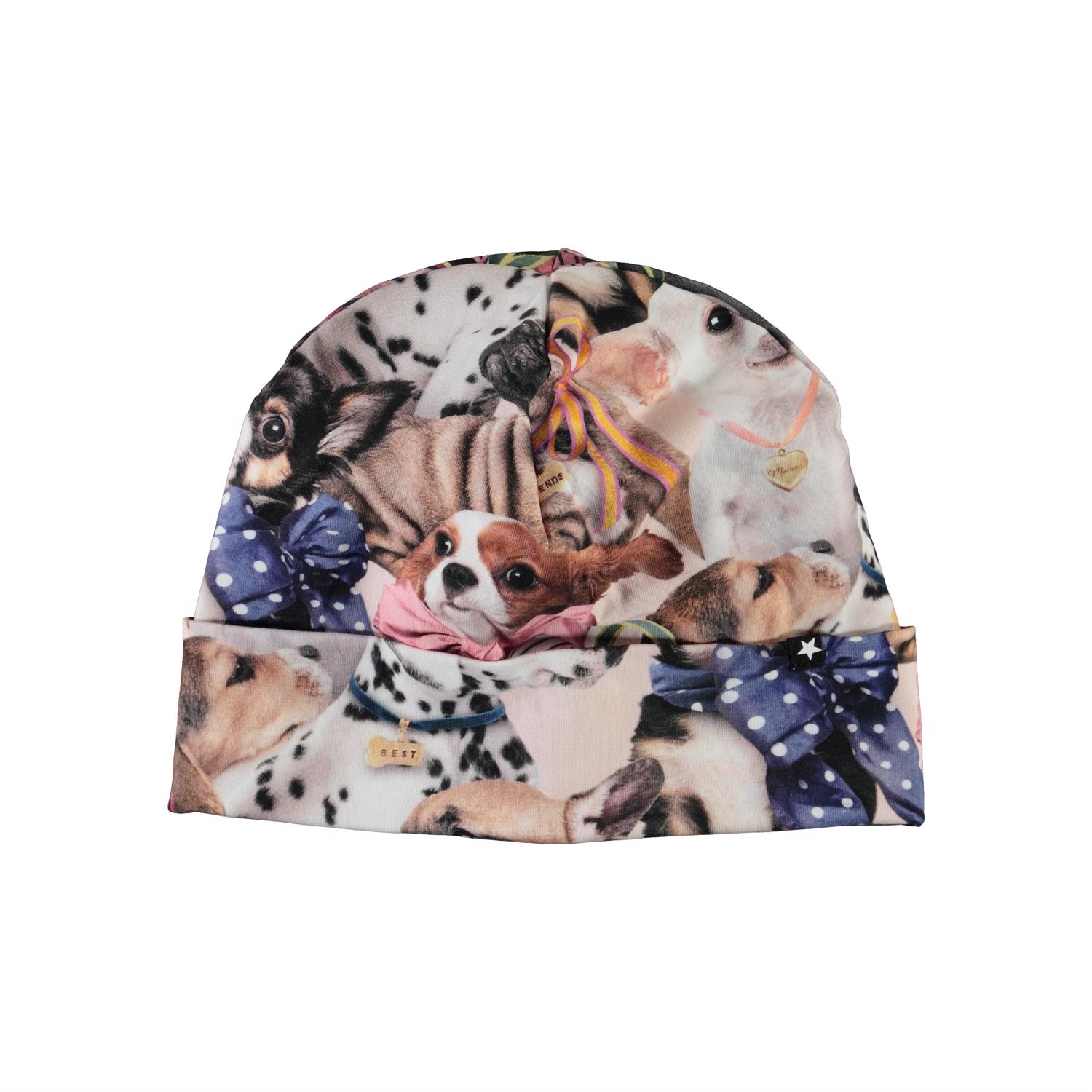 Blød og elastisk dobbeltlaget hue med print af hunde. Huen kan bruges med og uden ombuk. Certificeret af Ecocert Greenlife, certifikationsnr. 197496.