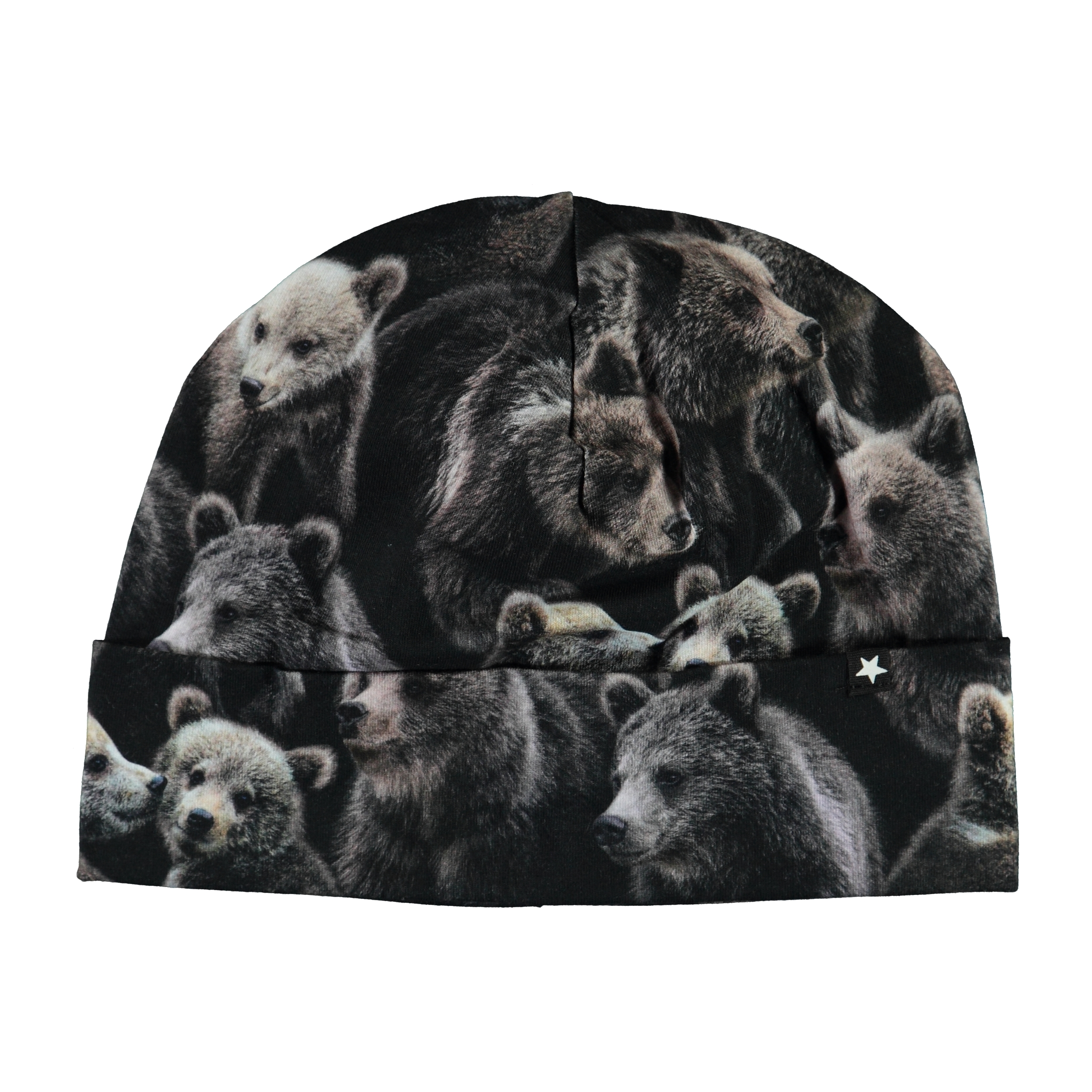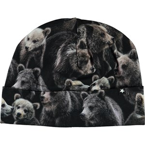Blød og elastisk dobbeltlaget hue med print af søde bjørne. Kan bruges med og uden ombuk.