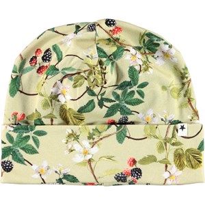 Blød og elastisk dobbeltlaget hue i lysegrøn med print af brombærranker. Huen kan bruges med og uden ombuk.