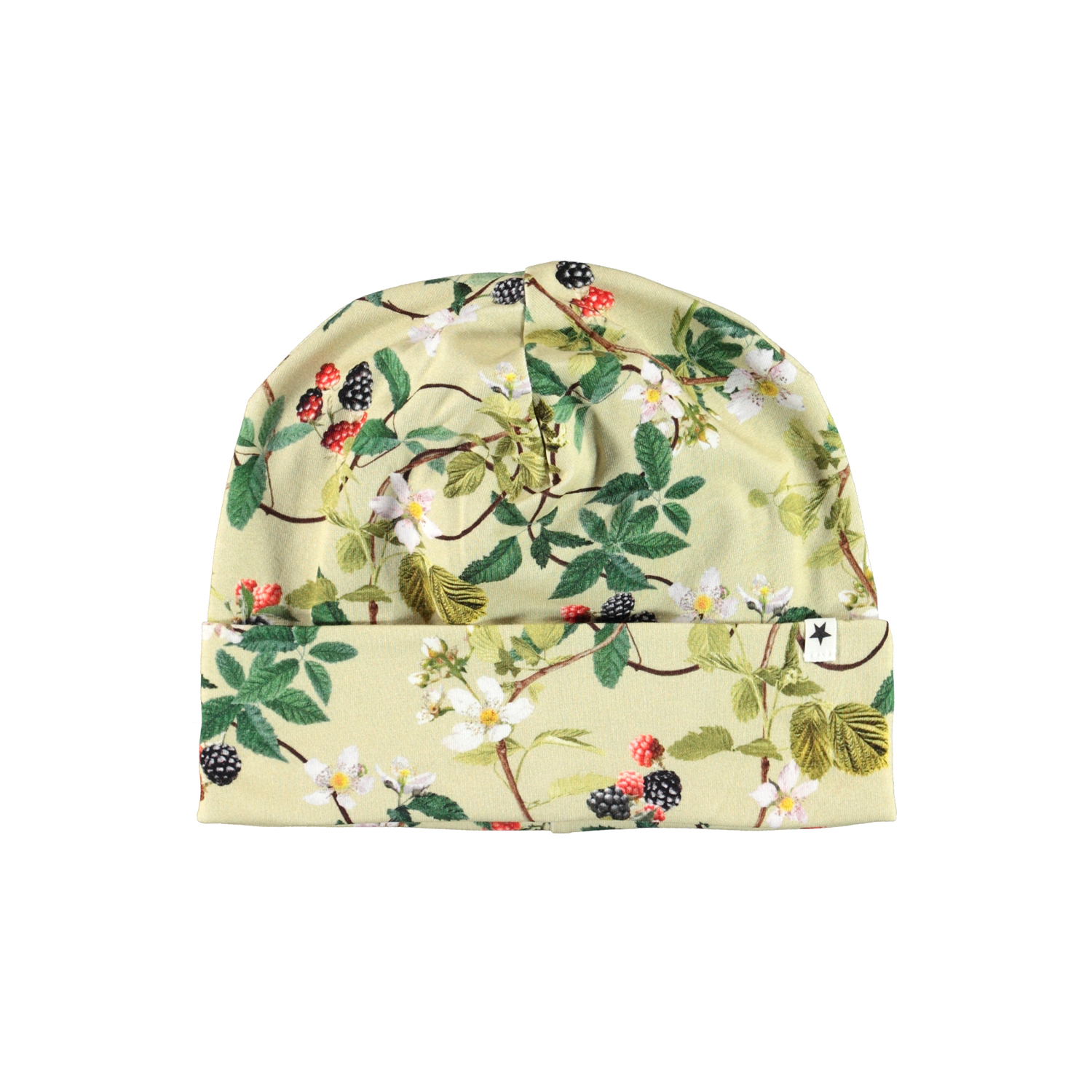 Blød og elastisk dobbeltlaget hue i lysegrøn med print af brombærranker. Huen kan bruges med og uden ombuk.