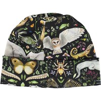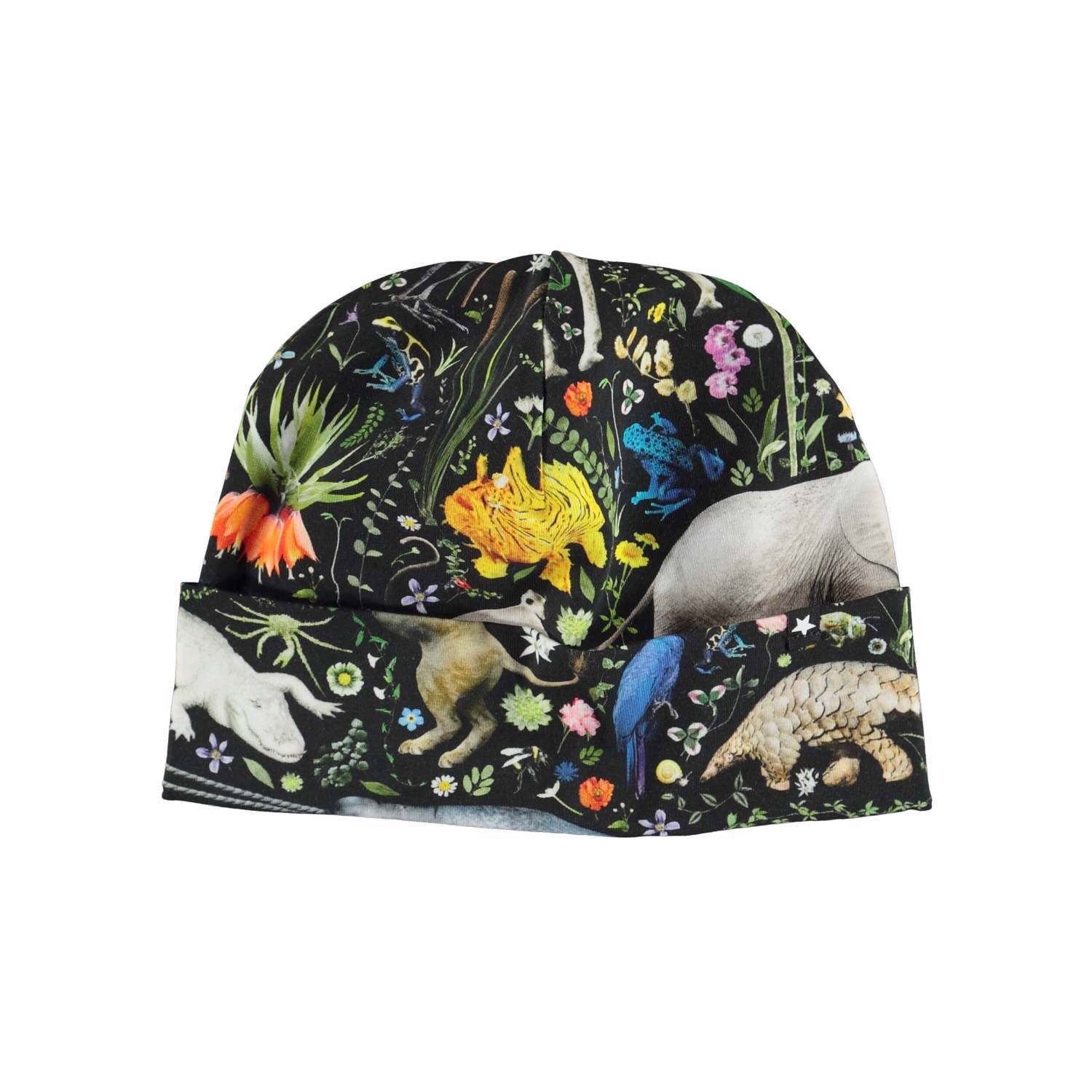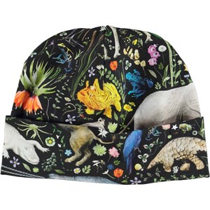 Blød og elastisk dobbeltlaget hue med print af fantasifulde og surrealistiske dyr på sort baggrund. Huen kan bruges med og uden ombuk.