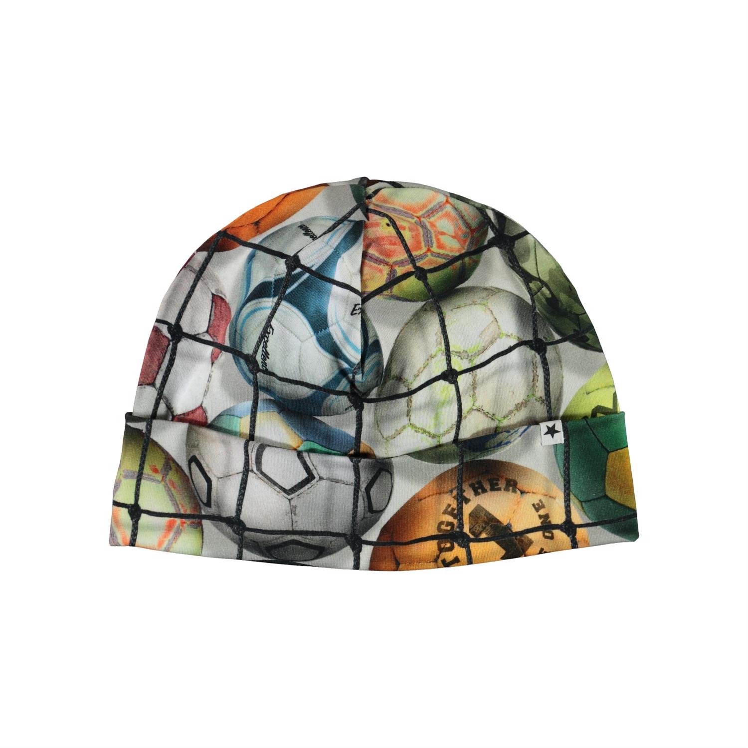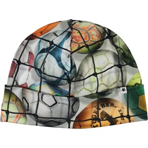 Blød og elastisk dobbeltlaget hue med af print af fodbolde. Huen kan bruges med og uden ombuk. Certificeret af Ecocert Greenlife, certifikationsnr. 197496.